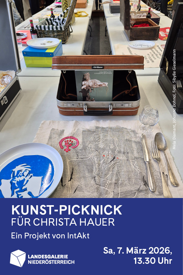 Für die Kunstaktion reisen IntAkt-Künstlerinnen mit Koffer und Picknick-Körben nach Krems um ein Kunst-Picknick in der Ausstellung von Christa Hauer in der Landesgalerie NÖ zu veranstalten.