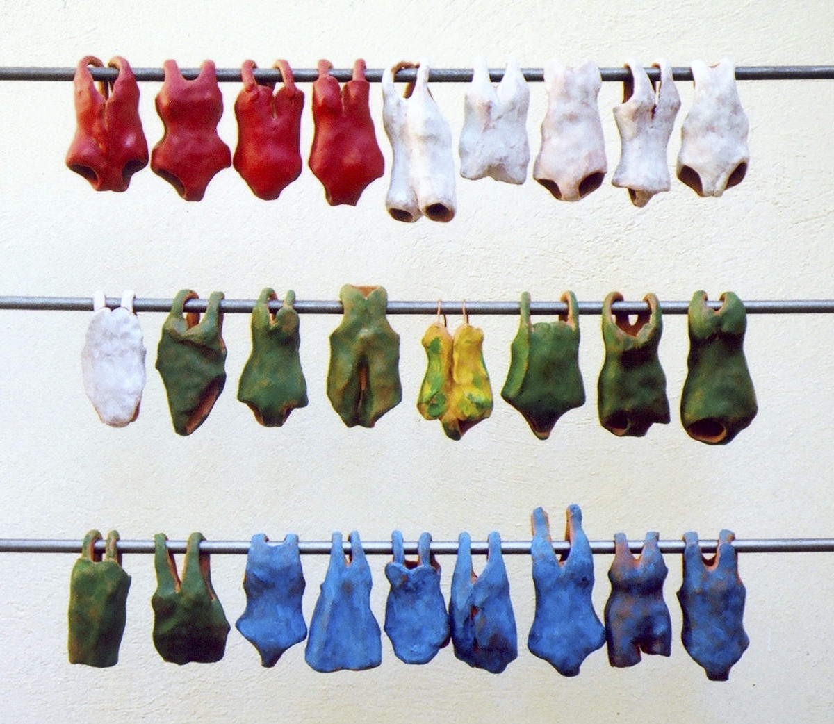 The figures are cast in porcelain fired in its natural colour. Evolved from prehistoric fertility figurines their appearance is stereotypical. Being dressed in bikini costumes they allude to participate in certain leisure rituals. The whole performance becomes a ritual in which certain aspects of female fertility rites are integrated within a predominantly male-orientated system.