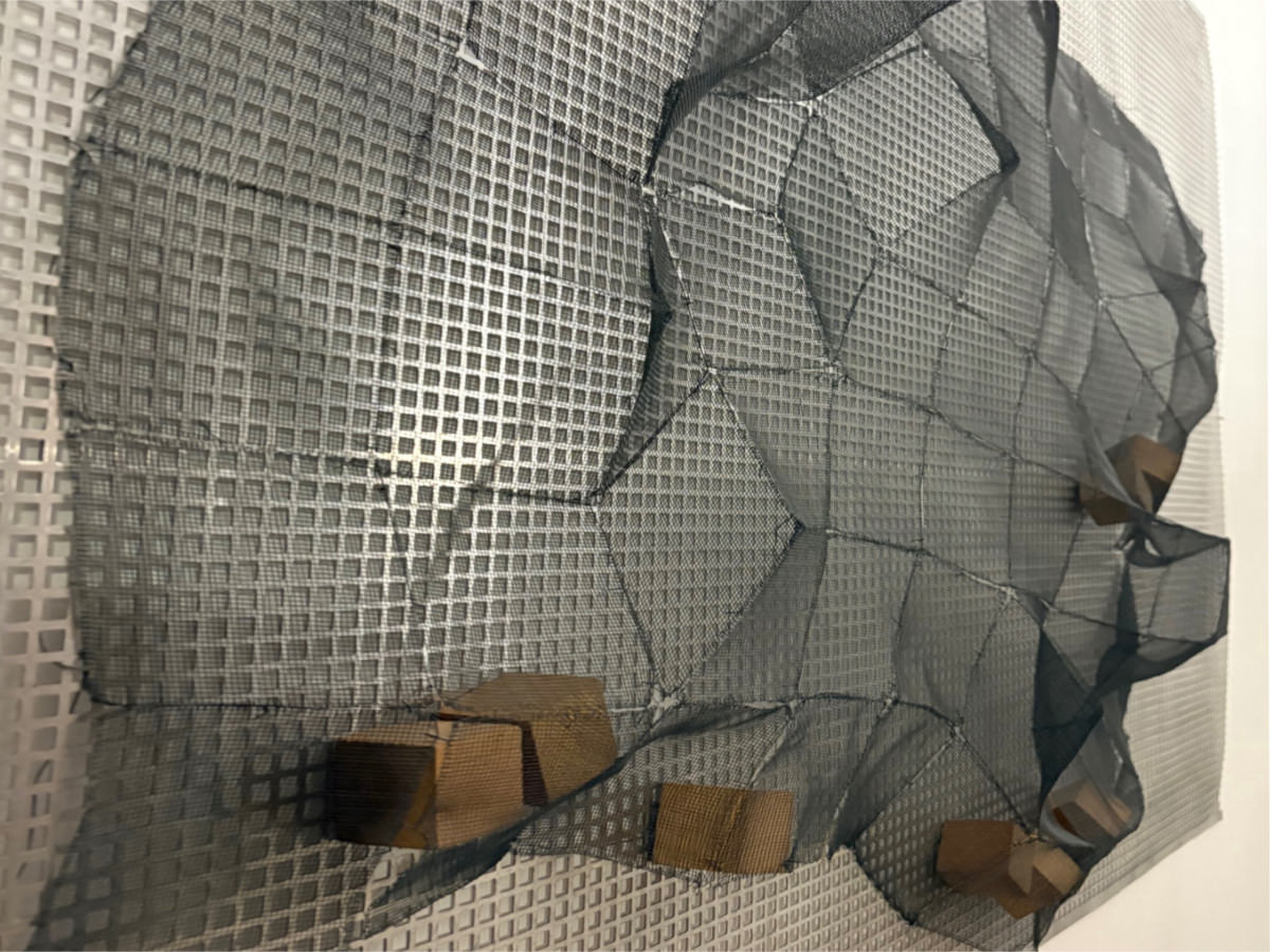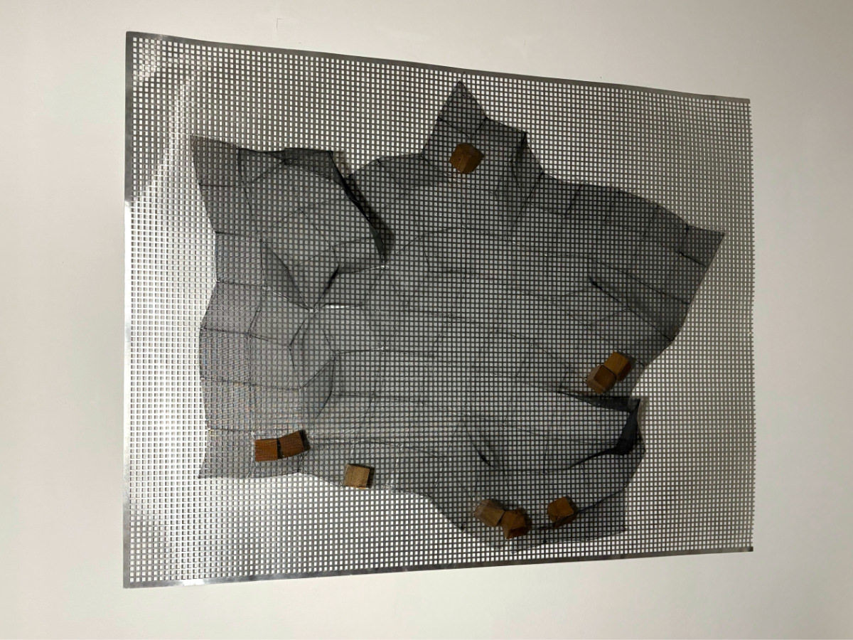 2001, wire grating, metal sheet, wooden cubes, 100 x 130 x 25 cm