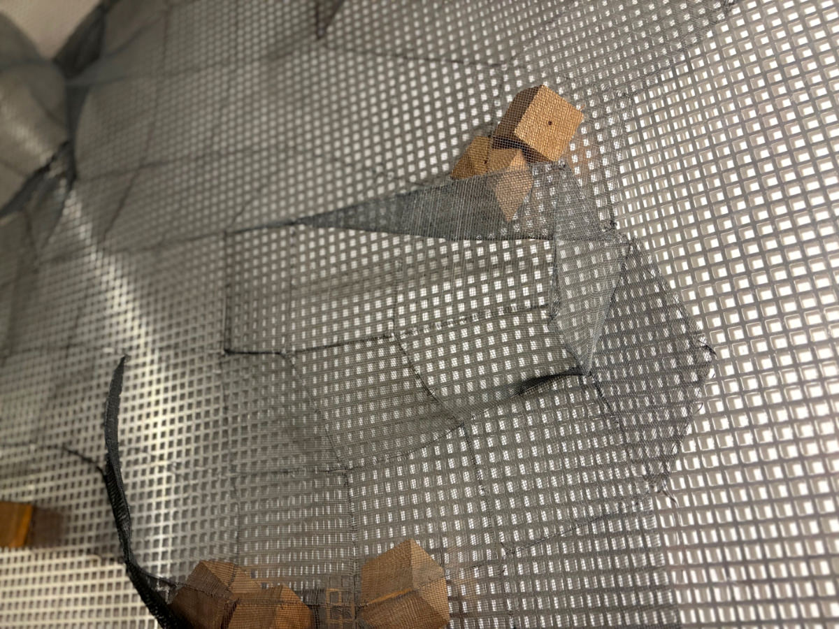 Two months in advance of the 20th anniversary of WUK (member of the Eurpean Network of Independent Cultural Centres on Former Industrial Sites) Susanne Kompast inquired 300 people about their opinion of the public institution WUK. 100 people were prepared to participate. Each opinion was transformed into a square shaped sheet of wire grating. The sheets were connected with each other using different ways according to the opinion of the questioned person: The wooden dice refer to the people not having a defined opinion.