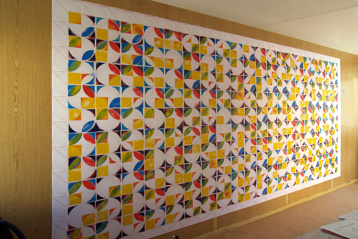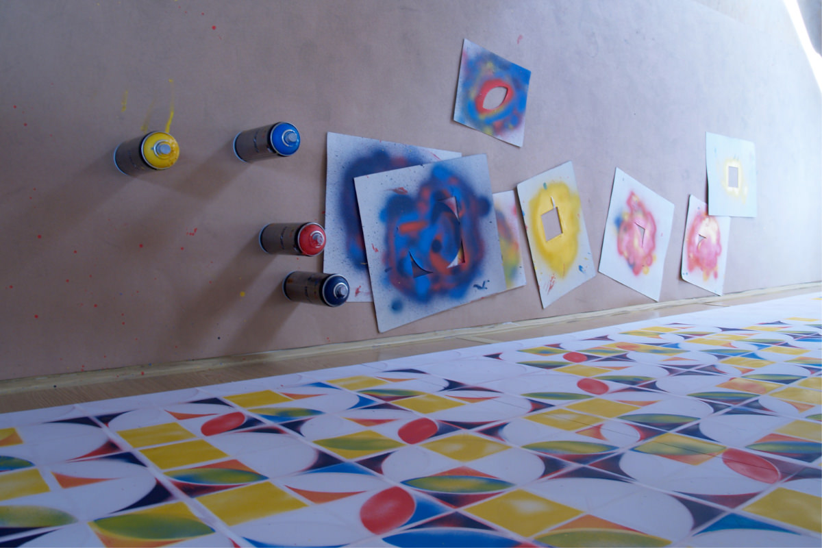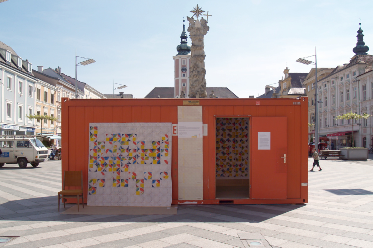 The montage was installed in a container put on the Gauss Square in Vienna. A few years ago the square was newly designed and the people living in this area seemed to be discontent. The people passing by were asked about their opinion on the new square. The answers are documented in the montage by coloured elements as black and white and grey.