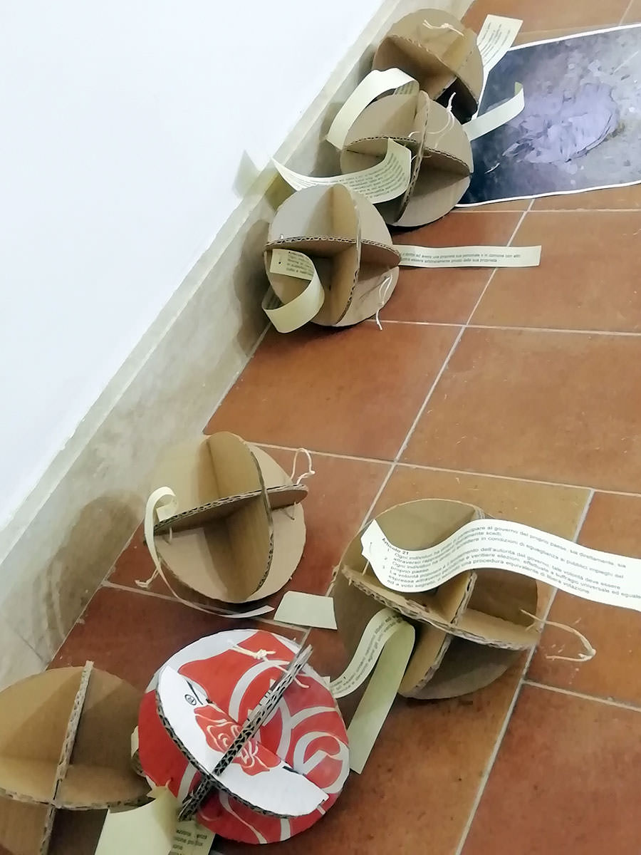 15 cardboard spheres, on each sphere were mounted two articles of the human rights convention. After declaring the Human Rights we burnt the spheres according to the inhuman acts during the World War II.